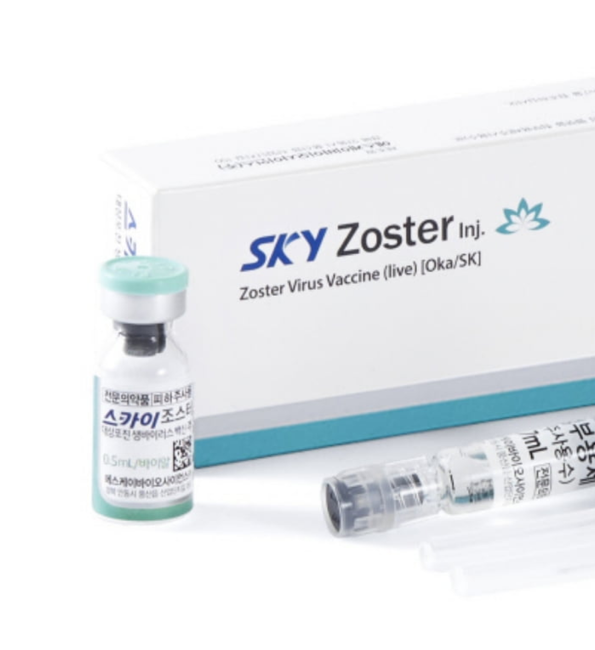 투명 바이알에 들어 있으며, 주사용수로 녹여 사용하는 백신입니다.